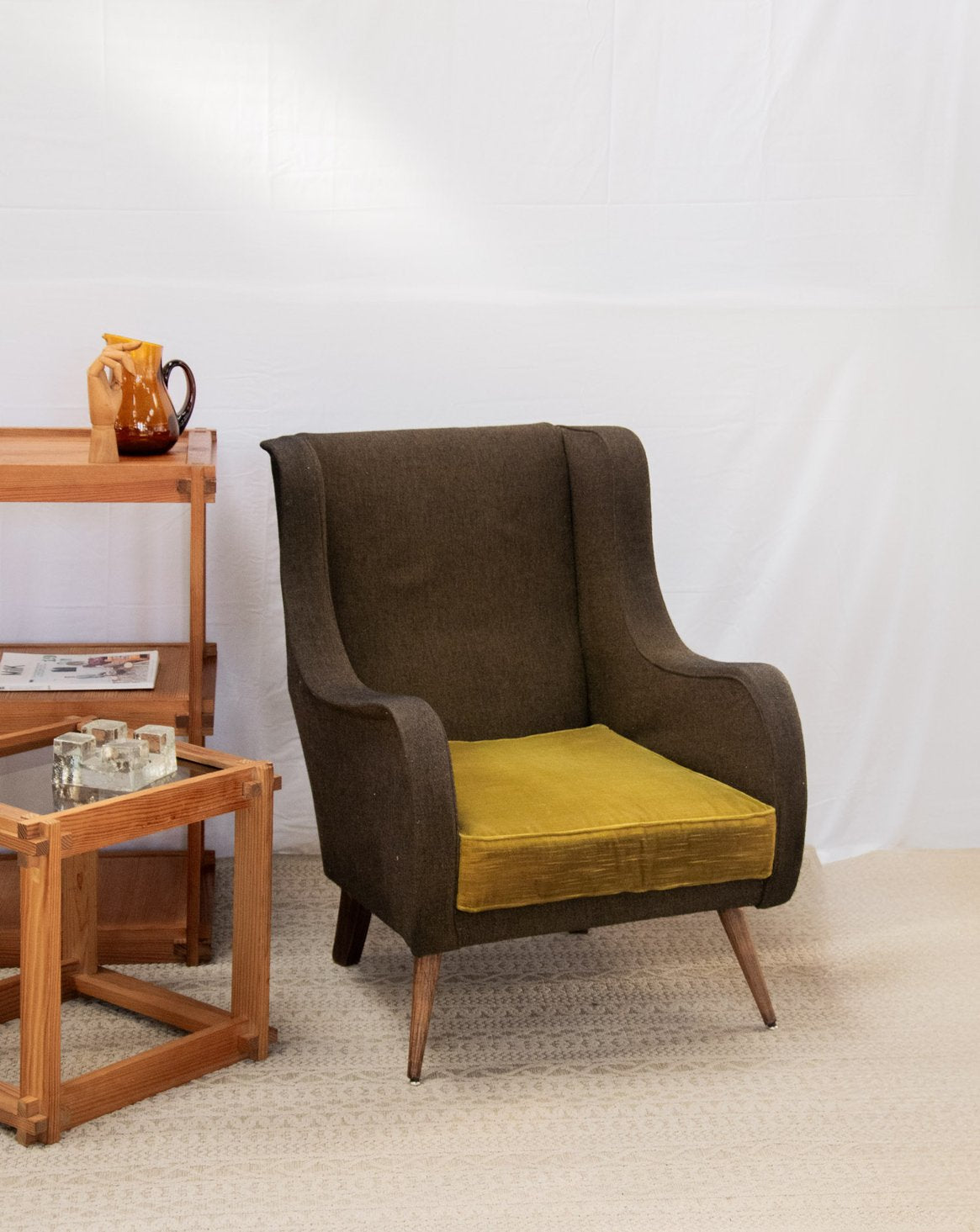 Découvrez ce fauteuil au style résolument rétro, mêlant un élégant tissu gris foncé et une assise vibrante de vert flash. Ses pieds compas en bois ajoutent une touche scandinave, tandis que les accotoirs incurvés offrent un confort optimal pour vos moments de détente. Conçu tout en tissu, ce fauteuil des années 50 réinvente votre espace avec son charme intemporel et sa modernité audacieuse. Un incontournable pour les amateurs de design vintage!