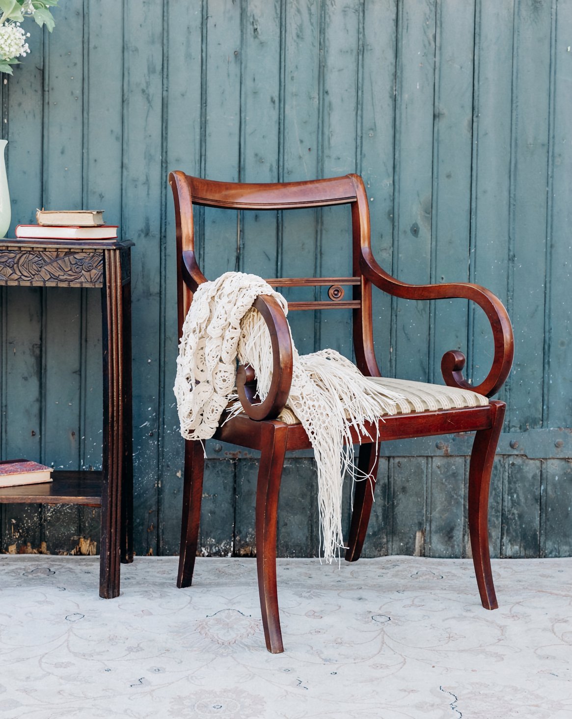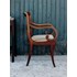 Adoptez cette chaise en bois foncé sculpté, habillée d'un tissu vert et beige à rayures et motifs qui souligne ses courbes élégantes; les pieds arqués et le travail des formes lui confèrent une silhouette raffinée, idéale comme siège d'appoint dans un salon, autour d'une table ou dans un coin lecture. L'assise confortable et le dossier enveloppant offrent un accueil chaleureux, apportant une note intemporelle et pleine de caractère à une ambiance classique ou contemporaine.