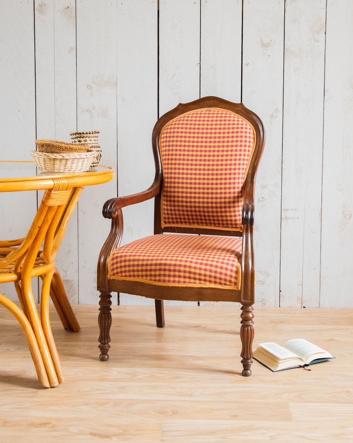 Adoptez ce fauteuil style Voltaire, habillé d'un tissu à motif quadrillé posé sur une structure en bois et garni d'une mousse généreuse. Ses proportions offrent une assise enveloppante, idéale pour un coin lecture ou pour compléter un salon élégant, apportant une présence chaleureuse et graphique. La combinaison du bois apparent et du motif structuré crée une silhouette sobre et inspirante, facilement intégrable dans un intérieur contemporain ou classique. Légères traces du temps présentes.