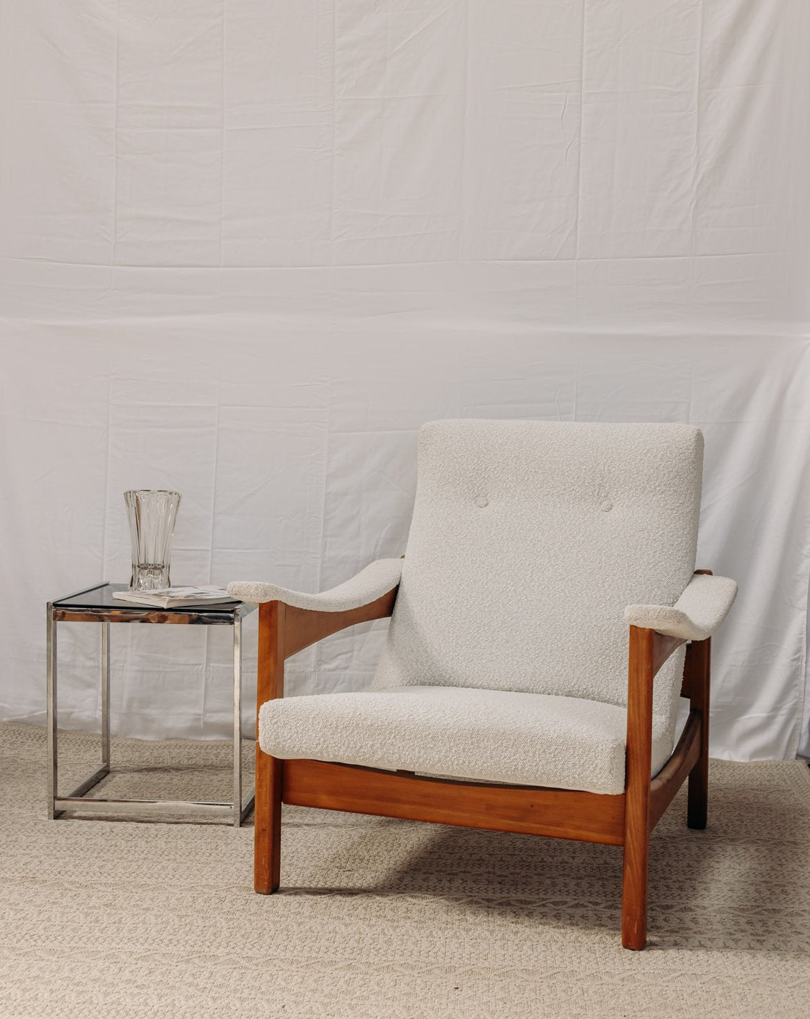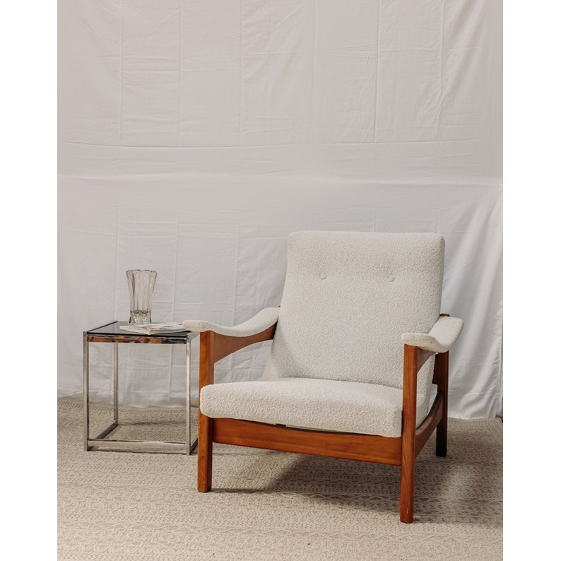 Découvrez ce fauteuil en tissu clair au charme rétro, de la marque G. Guermonprez, datant des années 40-50. Son grand dossier et ses accotoirs incurvés offrent un confort optimal, tandis que sa structure en bois clair ajoute une touche d'élégance à votre intérieur. Dans un état comme neuf, ce fauteuil moumoute est idéal pour créer un espace cocooning plein de style. Une pièce vintage qui saura séduire tous les amateurs de design d'époque.