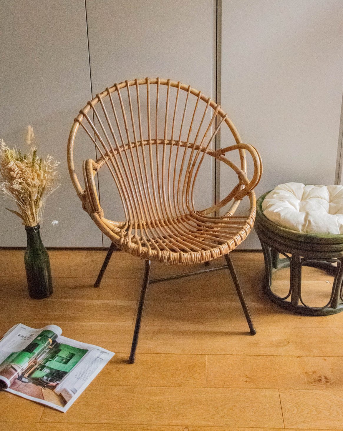 Adoptez ce fauteuil en rotin au piètement en métal noir, qui associe la légèreté organique du tressage à une silhouette contemporaine et graphique. Son assise compacte et son dossier enveloppant en font un siège parfait pour un coin lecture, une véranda ou une entrée où chaleur et élégance se rencontrent. Un exemplaire a connu des réparations. Quelques marques d'usage qui font son authenticité.
