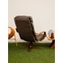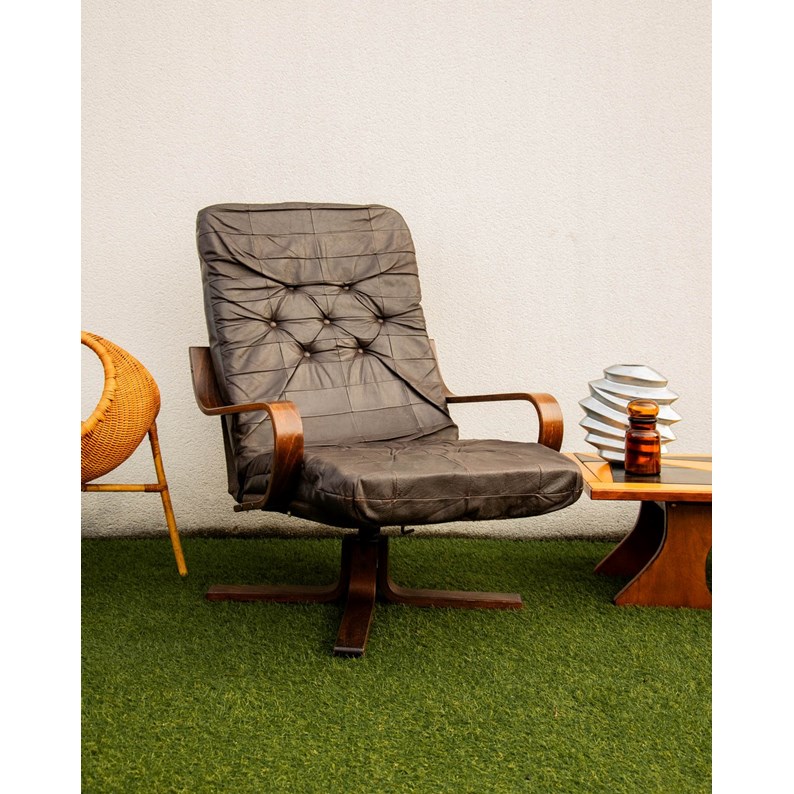 Adoptez ce fauteuil pivotant scandinave vintage au design typique des années 1960-70, dont la structure en bois courbé verni dessine des lignes élégantes et aériennes. L'assise et le dossier en skaï brun capitonné offrent un confort enveloppant et s'inclinent légèrement pour un maintien détendu, parfait dans un salon, un coin lecture ou un bureau. Sa belle patine du temps lui apporte une authenticité nordique chaleureuse et discrète. Quelques marques d'usage qui font son authenticité.