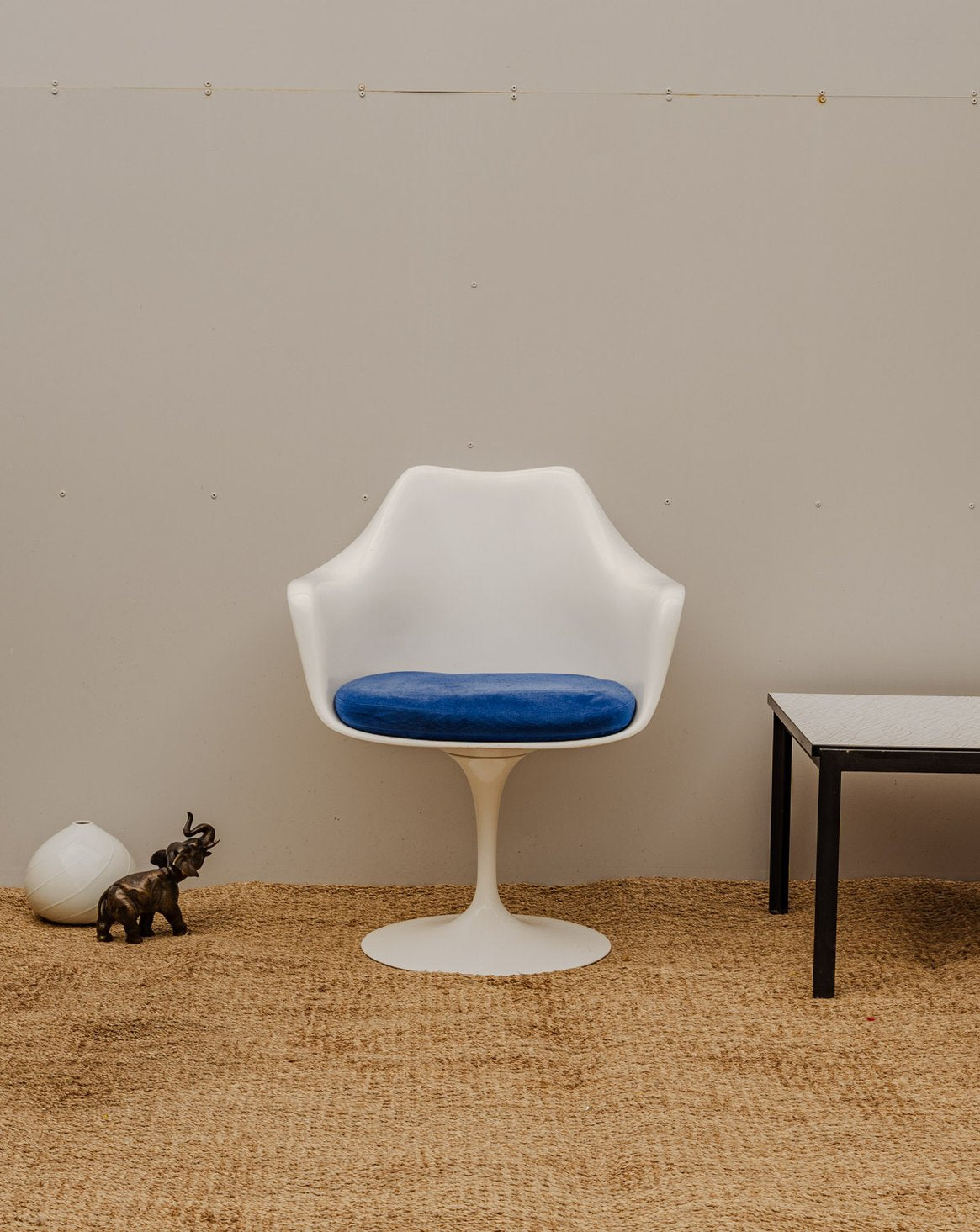 Adoptez ce fauteuil pivotant signé Knoll, habillé d'une armature métallique blanche et d'un coussin bleu légèrement velours qui apporte une silhouette moderne et douce. Sa profondeur d'assise et ses proportions en font une pièce idéale pour un coin lecture, un bureau ou un salon où l'on recherche confort et élégance discrète. Le contraste métal et velours crée une ambiance contemporaine chaleureuse, facile à intégrer dans différents styles d'intérieur. Quelques marques du temps présentes.