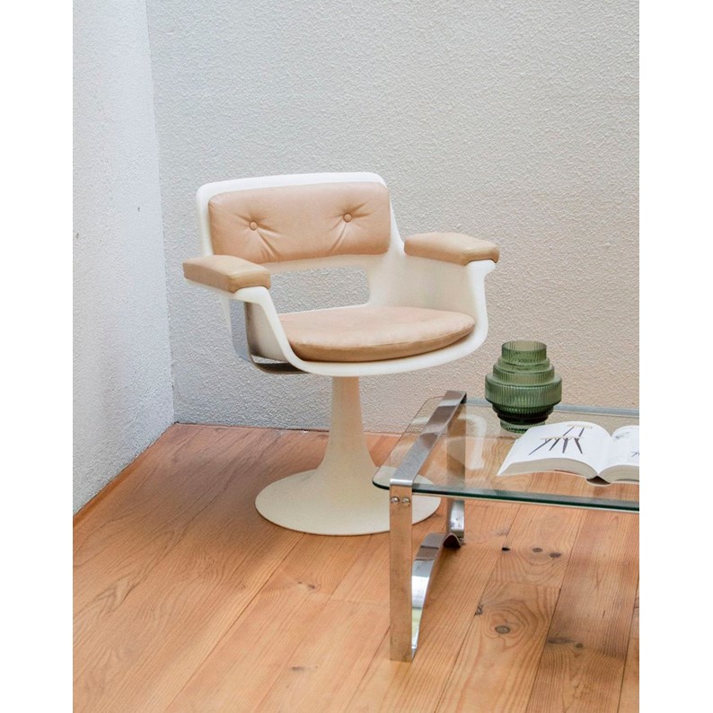 Adoptez le fauteuil tulipe signé Albert Jacob, habillé d'un skai beige sur le dossier, l'assise et les accotoirs et reposant sur une structure plastique moulée au profil organique. Son assise confortable et ses proportions équilibrées en font un siège idéal pour un coin lecture, une salle à manger contemporaine ou un bureau design. Le mélange de matériaux offre une allure sobre et chaleureuse, facile à intégrer dans une décoration épurée ou rétro. Sa silhouette sculpturale crée une ambiance raffinée et accueillante.