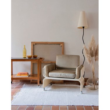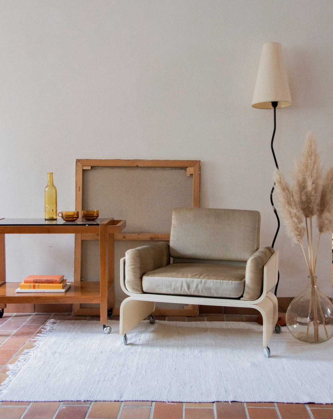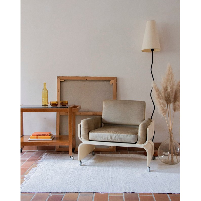 Découvrez cette magnifique chauffeuse / fauteuil de style space age des années 70, alliant une structure en bois courbé laqué blanc à trois coussins en velours beige d'origine. Inspiré des créations emblématiques de Mario Bellini, son design audacieux et élégant fait de cette pièce un incontournable du mobilier contemporain. Avec ses petites roues parfaitement fonctionnelles et son confort exceptionnel, cette assise se révèle à la fois pratique et esthétique. En très bon état général, ce fauteuil ne présente aucun trou sur le tissu et apportera une touche d'originalité à votre intérieur.