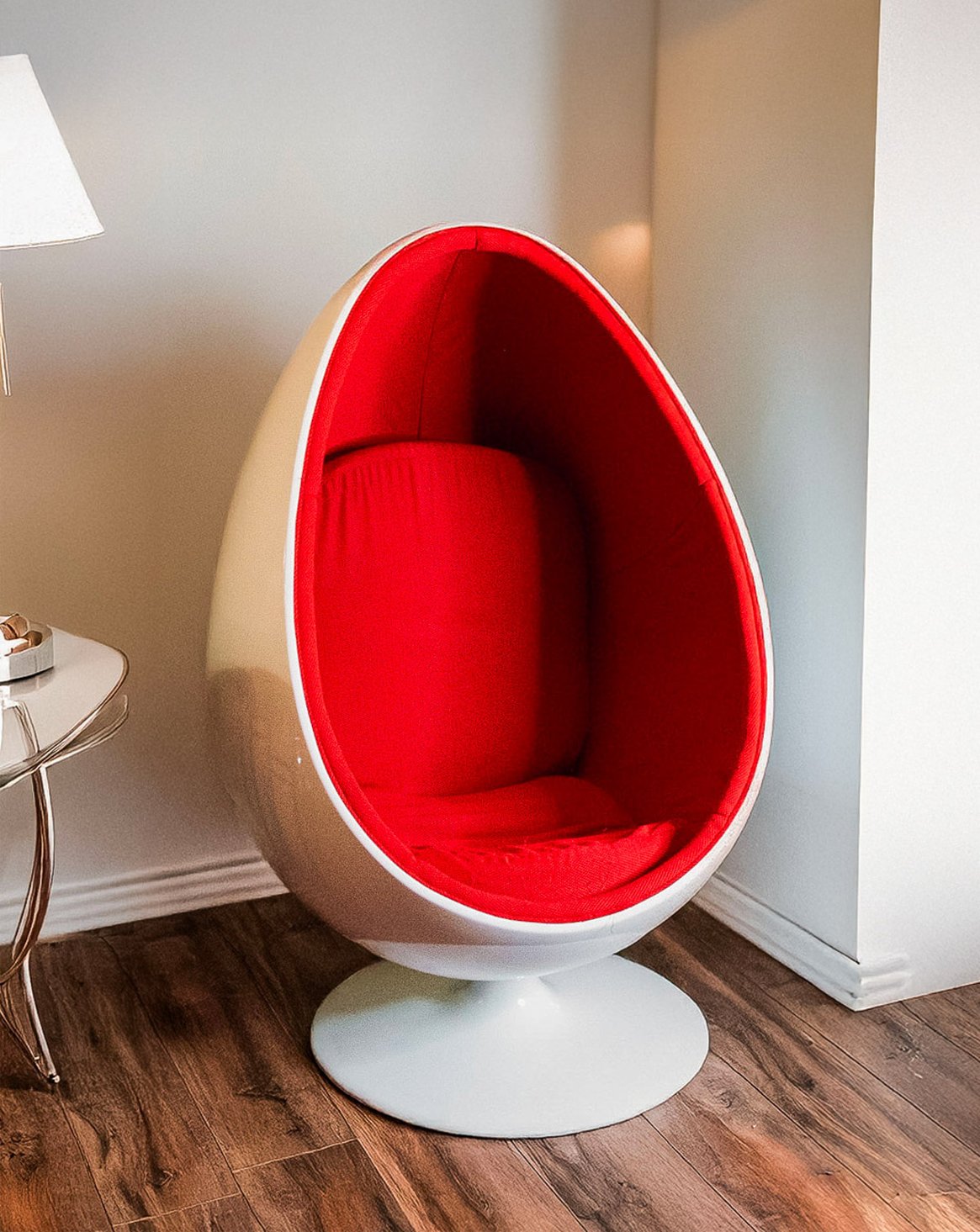 Adoptez ce fauteuil Egg au style space age, sa coque blanche enveloppante et son intérieur rouge apportent un contraste graphique et chaleureux. Le piètement tulipe rond et la base pivotante offrent une assise confortable et modulable, idéale pour un coin lecture ou un salon au charme rétro-futuriste, tandis que les coussins entièrement déhoussables facilitent l'entretien au quotidien. Légères traces du temps présentes, dont une rayure sur un côté et le tissu qui s'est effiloché légèrement par endroit sur l'assise.