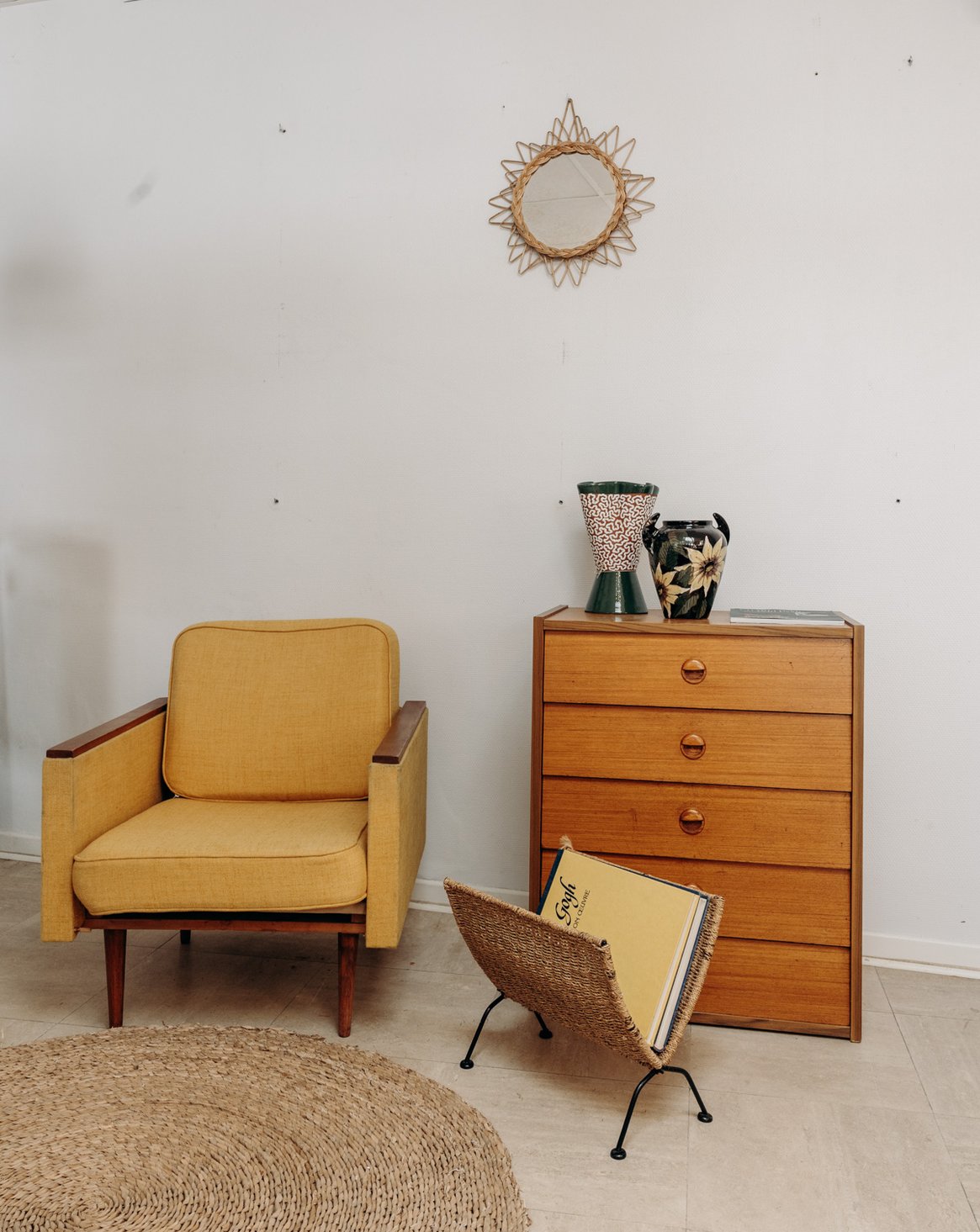 Découvrez ce magnifique fauteuil vintage des années 60, alliant confort et design intemporel. Son revêtement en tissu jaune moutarde apporte une touche lumineuse et chaleureuse à votre intérieur, tandis que ses accoudoirs en bois massif ajoutent une élégance authentique. Avec une assise large et confortable, ce fauteuil est idéal pour créer un coin lecture convivial ou enrichir le charme d’un salon. Un incontournable pour les amateurs de style mid-century et scandinave !