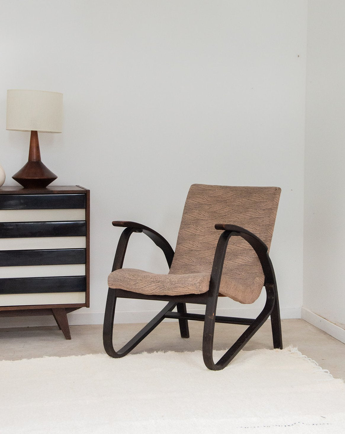 Découvrez ce fauteuil en bois foncé signé Jan Vanek, une pièce unique alliant confort et style. Bien que des traces d’usure sont présentes sur les accotoirs, son assise et son dossier en tissu continu beige/zébré apportent une touche d'élégance à votre intérieur. Idéal pour créer une ambiance chaleureuse, ce fauteuil s’intégrera parfaitement dans votre décoration. Offrez-vous un moment de détente dans ce mobilier au charme authentique.