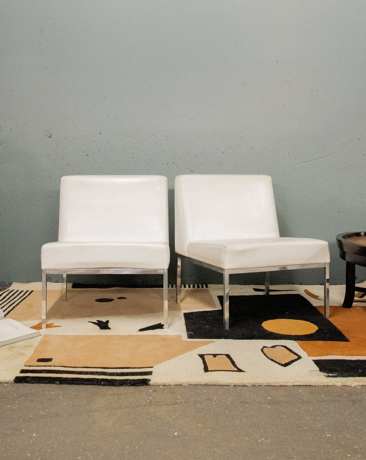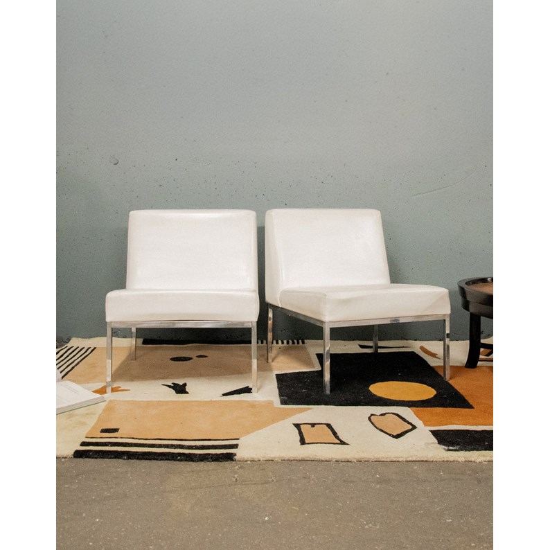 Adoptez cette paire de chauffeuses belges des années 60 à structure en métal chromé et revêtement en skaï blanc, qui marie élégance rétro et simplicité contemporaine. Le dossier généreux et la large assise offrent un confort d'accueil parfait pour un salon, un bureau ou un coin lecture, tandis que les pieds droits soulignent une silhouette graphique et stable. Leur proportion compacte permet d'installer deux exemplaires sans alourdir la pièce. Légères traces du temps présentes.