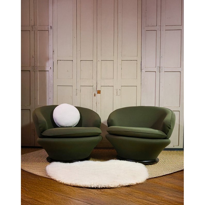 Adoptez ces fauteuils du designer Bernard Brunier, habillés d'un jersey vert kaki d'une belle sobriété et posés sur un socle en bois chaleureux. La proportion étudiée et l'assise accueillante offrent un confort enveloppant et un dossier soutenant, idéal pour un coin lecture ou un salon intimiste. Leur silhouette combine modernité douce et élégance intemporelle, apportant une atmosphère sereine et raffinée à votre intérieur.
