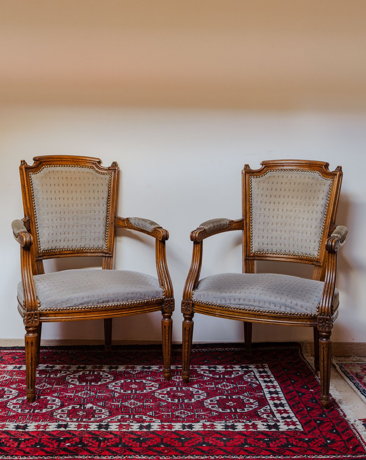 Paire de fauteuils en bois et tissu gris n°868
