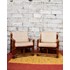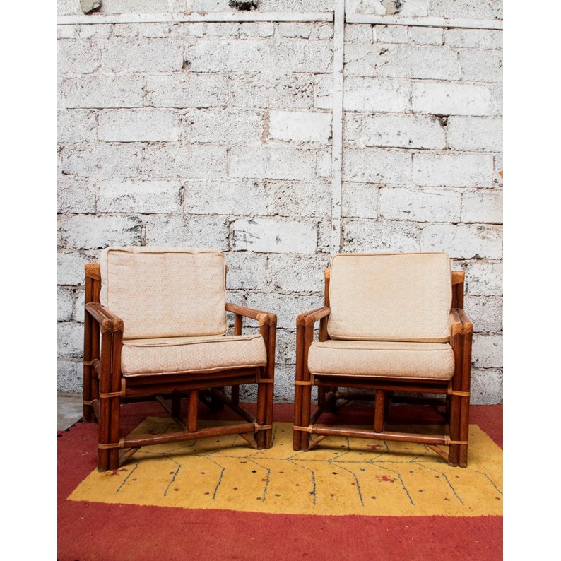 Adoptez cette paire de fauteuils en rotin foncé au dossier carré et à la structure généreuse, idéale pour composer un coin détente aux tonalités naturelles. Le rotin confère chaleur et texture, tandis que les coussins beiges apportent un confort moelleux et un subtil contraste chromatique. Leur assise ample et leurs proportions confortables s'adaptent au salon, à une véranda ou à un bureau cosy, et l'allure graphique instaure une ambiance bohème-chic élégante. Légères traces du temps présentes.