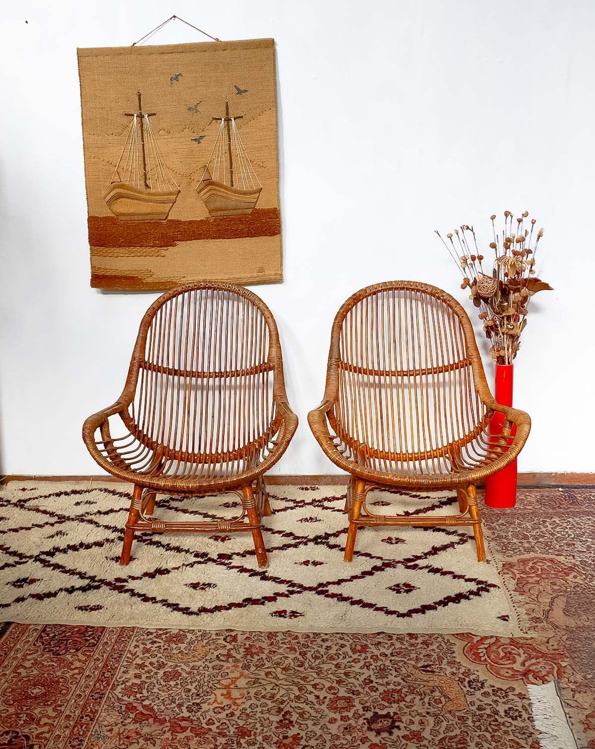 Adoptez cette paire de fauteuils en rotin et bois foncé des années 60, qui marient une silhouette aérienne à une solide structure vintage. Leurs assises amples et dossiers hauts invitent à la détente, parfaits pour un salon, une véranda ou un coin lecture au style chaleureux et naturel. Les matériaux naturels apportent une note bohème raffinée, tandis que l’esthétique rétro s’intègre facilement à un intérieur contemporain.