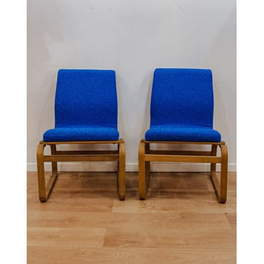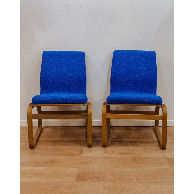 Adoptez ces fauteuils au style danois, habillés d'un tissu bouclette bleu chaleureux qui enveloppe l'assise et le dossier. La structure en bois apporte une légèreté visuelle idéale pour un salon, un coin lecture ou une chambre. Ils conjuguent confort et élégance discrète, créant une ambiance intime et contemporaine. Quelques marques d'usage qui font son authenticité.
