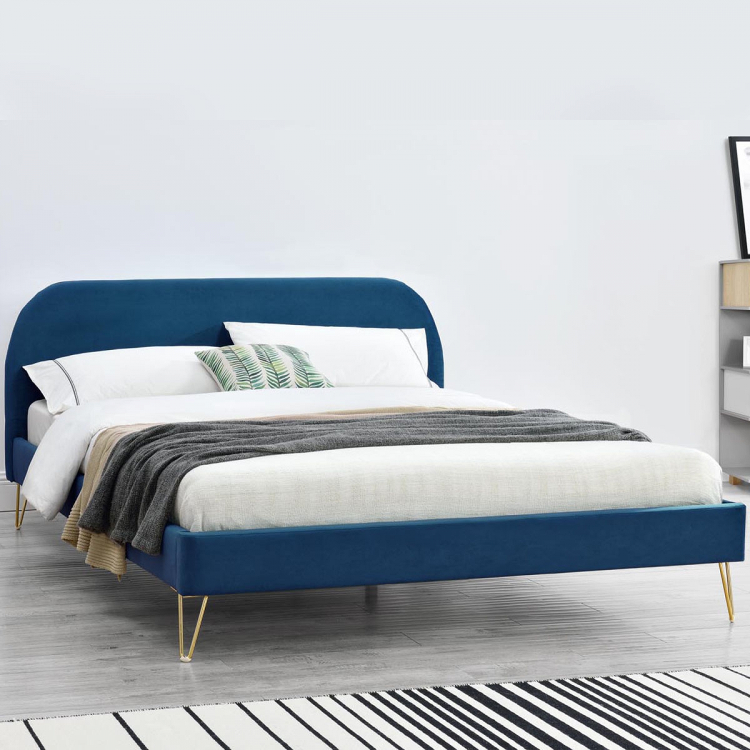 Craquez pour ce lit aux jolis courbes et aux finitions velours ! Ses pieds couleur laiton et sa couleur bleu fonce lui donne un certain cachet.