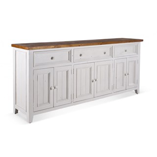 On adore les petites moulures qui décorent les tiroirs et les portes de ce buffet en bois blanc rustique.