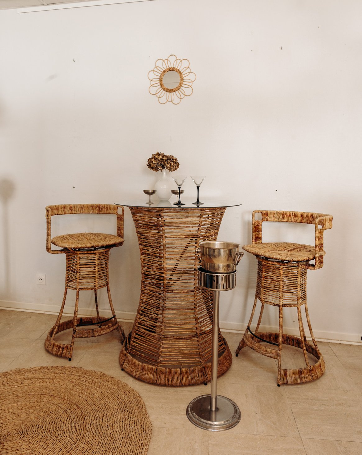 Découvrez le salon bar en rotin, une pièce emblématique du design tropical des années 1960-70, signée Roger Coster. Fabriqué en Haïti, cet ensemble se compose d'une table haute raffinée et de tabourets assortis, alliant légèreté et robustesse grâce à son tressage aérien. Le plateau en verre ajoute une touche de sophistication, tandis que le rotin met en valeur un artisanat traditionnel fusionné avec un style moderniste. Notez qu'un bord du plateau présente une légère imperfection et quelques lanières de rotin sont abîmées, comme indiqué sur la photo, mais cela n'enlève rien au charme de cette pièce rare, idéale pour les passionnés de mobilier vintage et de décoration exotique chic. Plateau en verre qui n'est pas fixé sur la structure.
