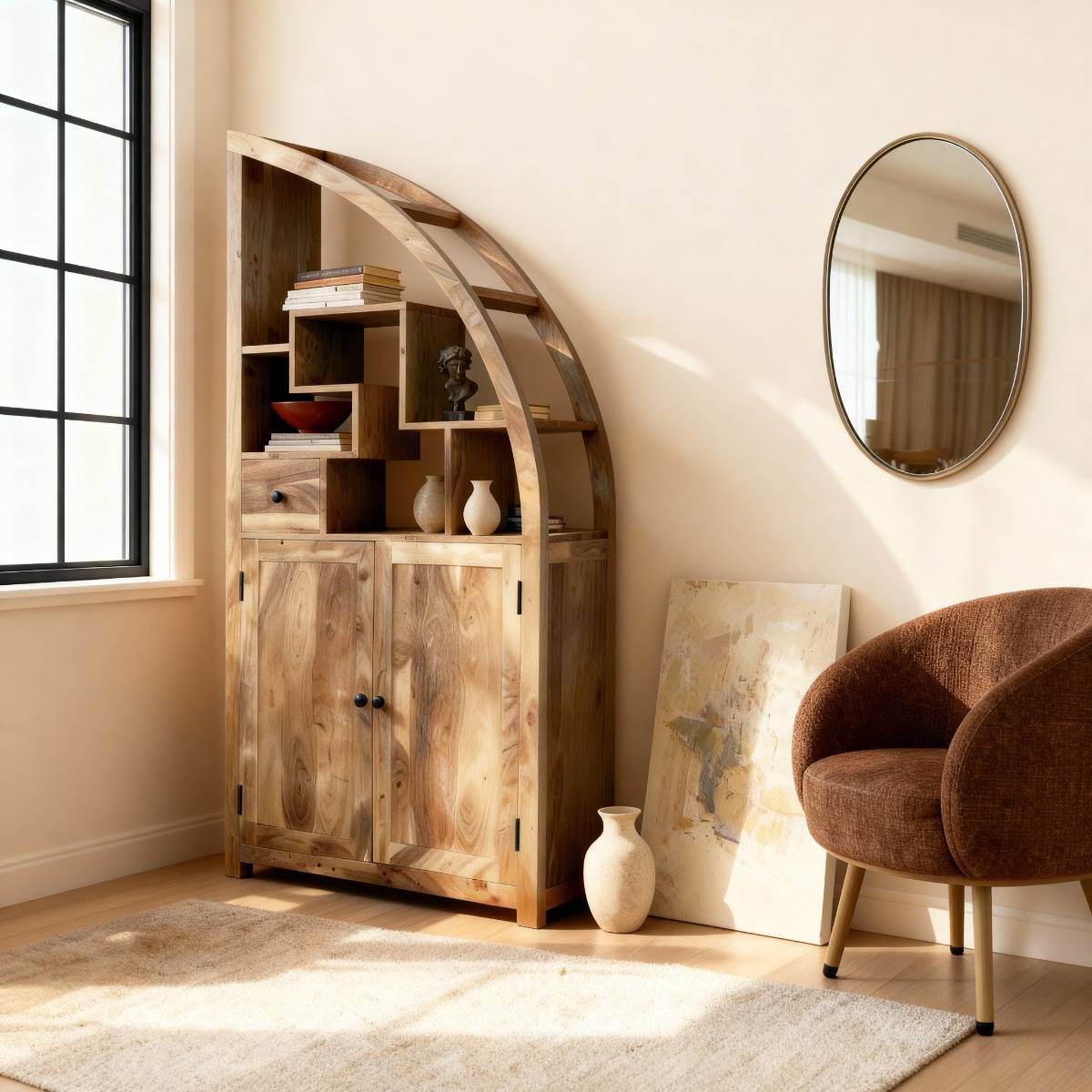 Bibliothèque asymétrique en bois massif. Structure demi-circulaire avec étagères ouvertes, portes et tiroir. Design original et contemporain, parfait pour exposer livres et objets déco.