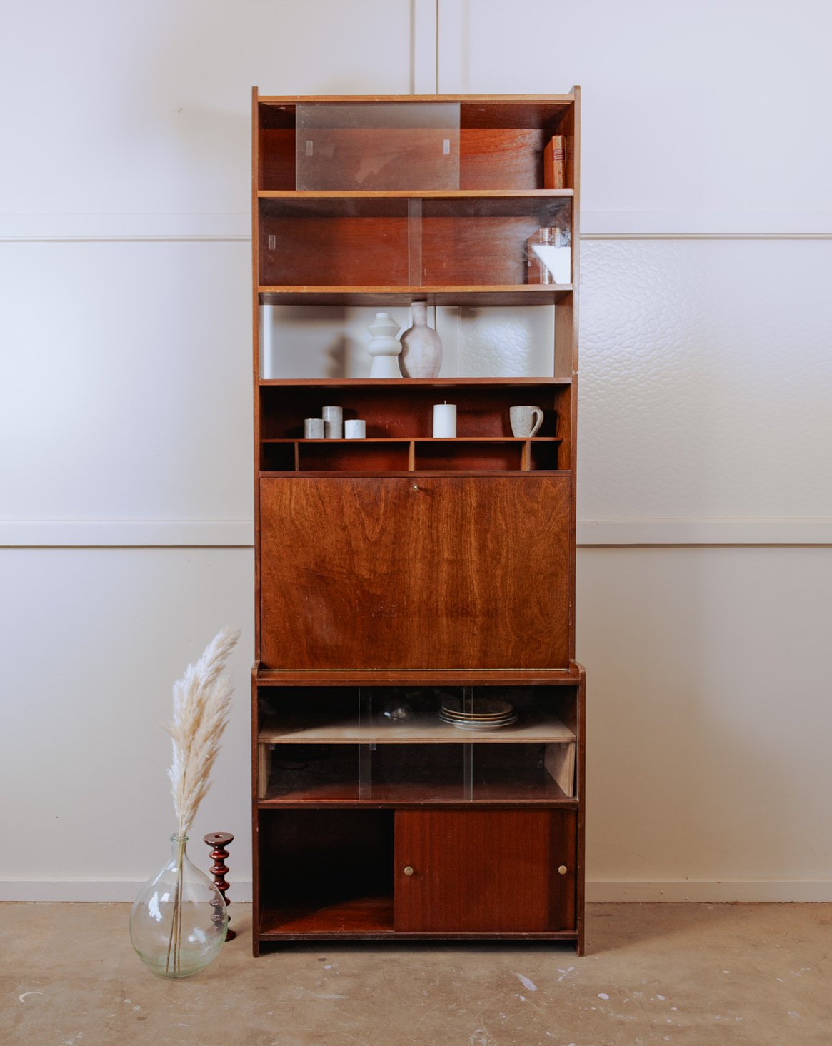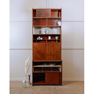 Adoptez cette bibliothèque secrétaire des années 60 au style scandinave, en bois foncé aux lignes épurées qui offre une belle capacité de rangement et de mise en valeur pour livres et objets. Composée de deux parties dissociées mais assemblées proprement, elle peut servir d'étagère indépendante ou être superposée (renforcement conseillé pour la mise en hauteur) ; le dos présente des trous pratiques pour le passage des câbles et un fond est manquant, tandis que la patine et les légères décolorations racontent son histoire. Légères traces du temps présentes.
