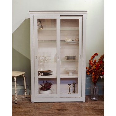 Adoptez cette bibliothèque en bois aux portes coulissantes vitrées, relookée d'un gris clair doux, qui apporte une note élégante et contemporaine à votre salon, bureau ou entrée. Ses étagères sont facilement interchangeables — trois fines en verre et une en bois repeinte en blanc — et permettent d'exposer livres, vaisselle ou objets décoratifs avec une belle lisibilité tout en optimisant l'espace. Quelques traces d'usure qui participent à son charme.