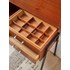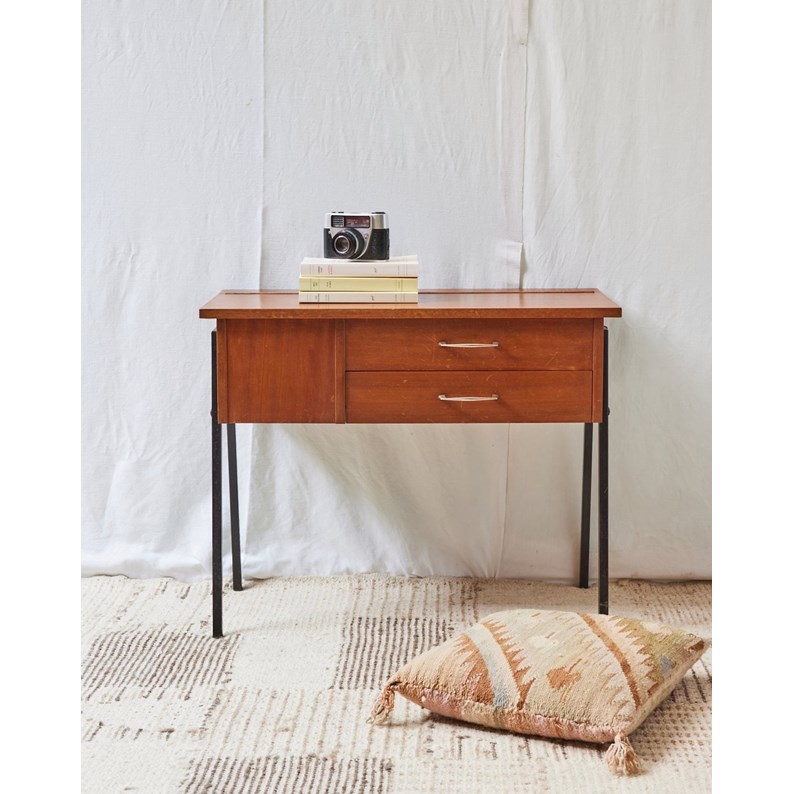 Adoptez cette travailleuse des années 70 en bois à piétement en métal noir, une pièce au charme rétro qui allie chaleur du grain et élégance industrielle. Sa structure élancée et ses compartiments pratiques accueillent outils et petits trésors tout en conservant des proportions discrètes, idéale comme table d'appoint dans un salon ou coin atelier. Le contraste entre le bois patiné et le métal mat crée une atmosphère raffinée et conviviale, apportant caractère et fonctionnalité à votre intérieur.