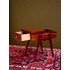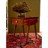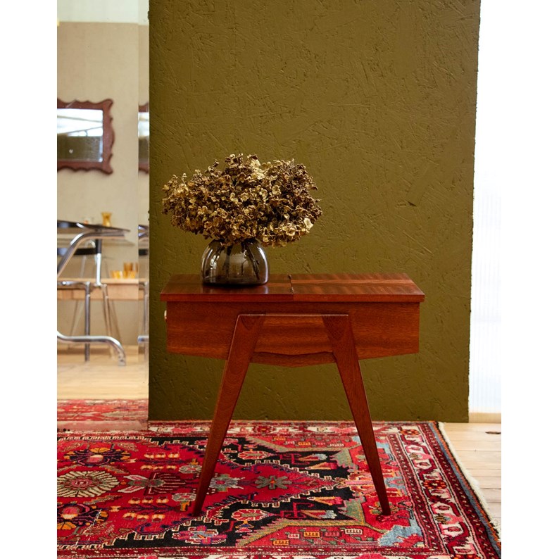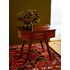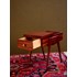 Découvrez cette travailleuse en bois exotique massif au veinage sombre, reposant sur quatre pieds fuseau délicats. Son plateau orné de marqueterie et sa poignée en métal doré créent un contraste raffiné, tandis qu'un tiroir et un coffre offrent un rangement discret pour outils et petits objets. Compacte et bien proportionnée, elle s'intègre comme chevet, meuble d'appoint ou dans une entrée, apportant une atmosphère chaleureuse et sobre.