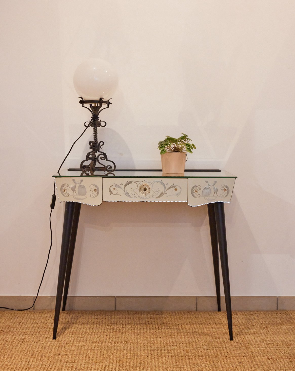 Le terme “coiffeuse” apparaît au début du XXème siècle, alors que le meuble existe depuis l’Antiquité. Composée d’une tablette, d’un ou plusieurs miroirs et de nombreux tiroirs, la coiffeuse est un meuble de rangement, mais surtout un lieu de préparation où l’on se maquille, se parfume et se coiffe. Si à l’origine, ce mobilier correspond aussi bien aux hommes qu’aux femmes, il devient très vite l’incarnation du mystère féminin. La coiffeuse peut en effet se munir de cachettes secrètes, afin de recevoir la correspondance intime. Aujourd’hui, la coiffeuse revient sur le devant de la scène et fonctionne très bien dans tous les style d'intérieurs !