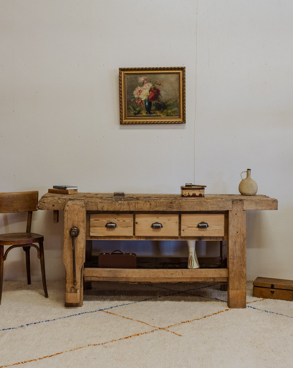 Adoptez cet établi en bois au charme fonctionnel, idéal comme console, îlot central ou plan de travail d'atelier. Sa large surface et ses trois tiroirs à poignées argentées coquillage offrent un rangement pratique tandis que l'étau apparent et le sous-plateau soulignent son origine de meuble de métier, pour une décoration à la fois utile et singulière. Sa patine naturelle et ses proportions apportent une ambiance chaleureuse et raffinée. Plusieurs traces du temps et d'usage témoignent de son histoire.
