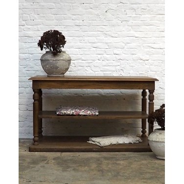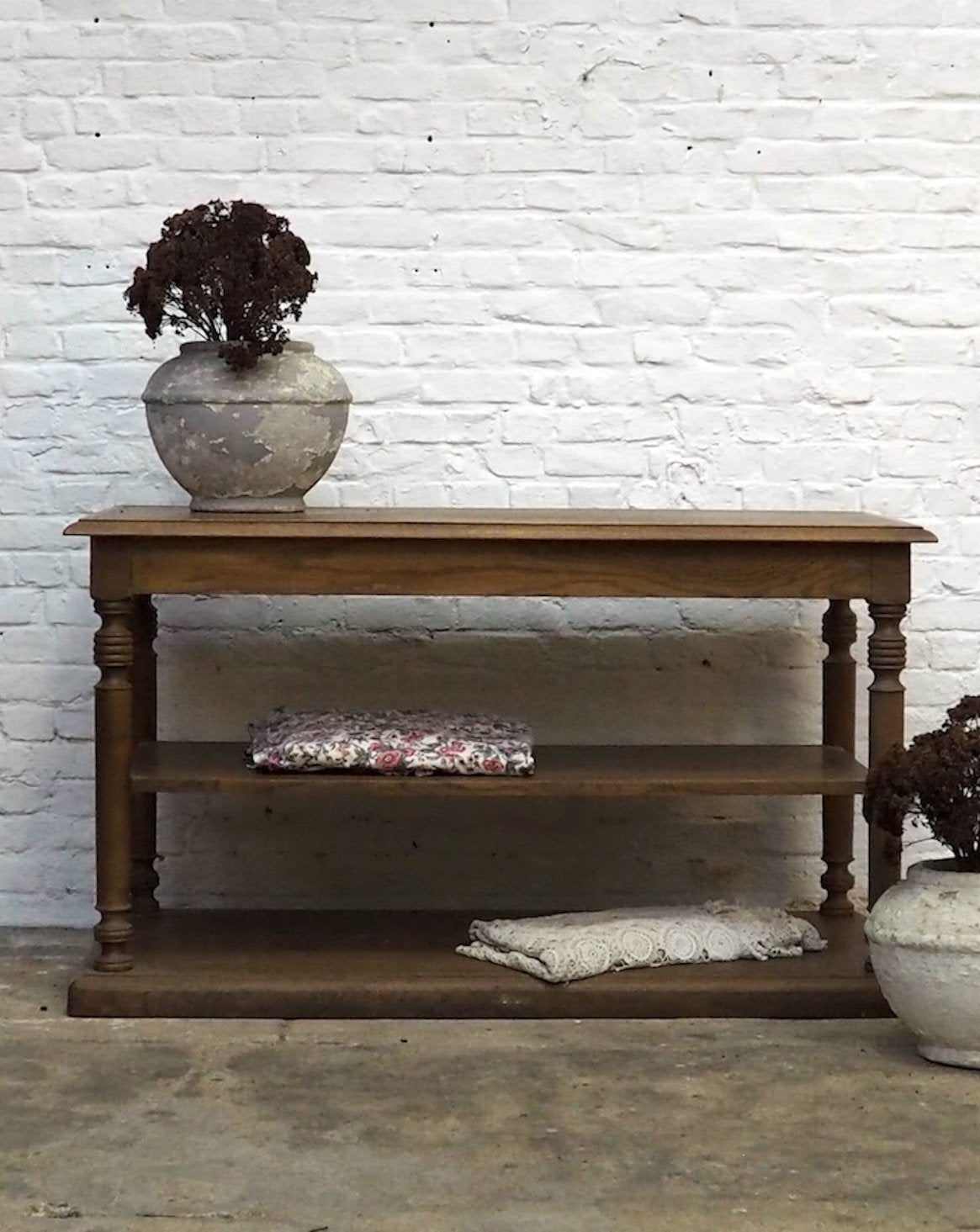 Adoptez ce meuble de métier drapier en bois massif, au caractère résolument authentique. Sa largeur généreuse et sa profondeur offrent un plan de travail solide et deux étagères pratiques pour ranger et mettre en scène le linge, la vaisselle ou les objets du quotidien. Sa patine naturelle et ses proportions robustes apportent une atmosphère chaleureuse et atelier à la cuisine, à la buanderie ou à l'entrée.