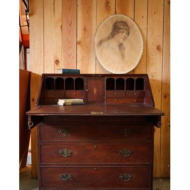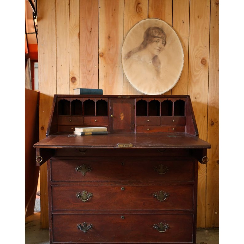 Adoptez ce bureau secrétaire ancien en bois aux lignes élégantes, équipé d'une tablette réglable qui se déploie en plan de travail fonctionnel et de jolies poignées en métal or vieilli apportant une touche raffinée ; ses proportions compactes renferment un généreux rangement avec plusieurs grands tiroirs en bas, deux tiroirs longs, de nombreuses niches et une petite porte pour organiser papiers et objets du quotidien, créant une atmosphère chaleureuse et studieuse. Légères traces du temps présentes dont un éclat sur le bois du battant visible lorsque celui-ci est fermé.