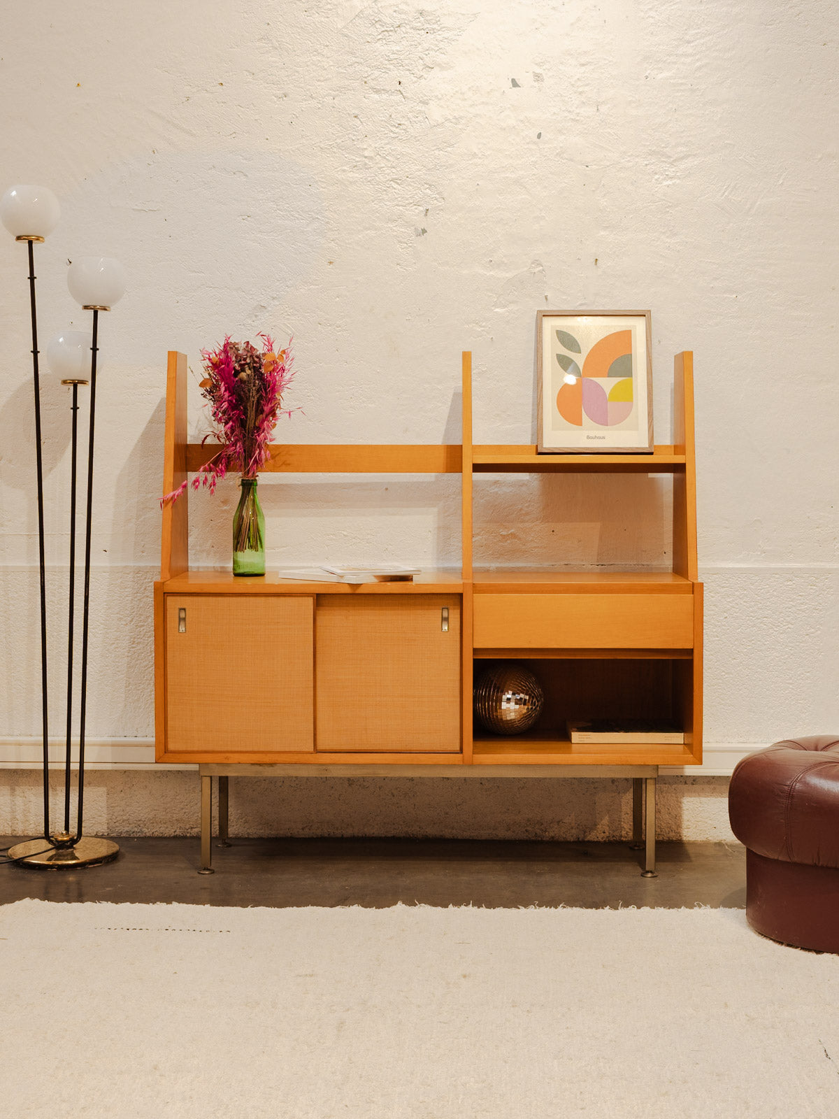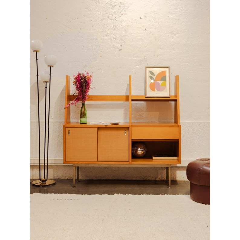 Découvrez ce buffet bibliothèque en enfilade des années 60, un incontournable du design vintage. Fabriqué en bois verni, il allie élégance et fonctionnalité grâce à sa niche ouverte, son étagère intégrée et son spacieux placard à portes coulissantes. Parfait pour mettre en valeur vos livres et objets déco tout en optimisant votre espace, ce meuble saura apporter une touche rétro à votre intérieur. Ajoutez une note d'authenticité à votre décoration avec ce chef-d'œuvre au charme intemporel.
