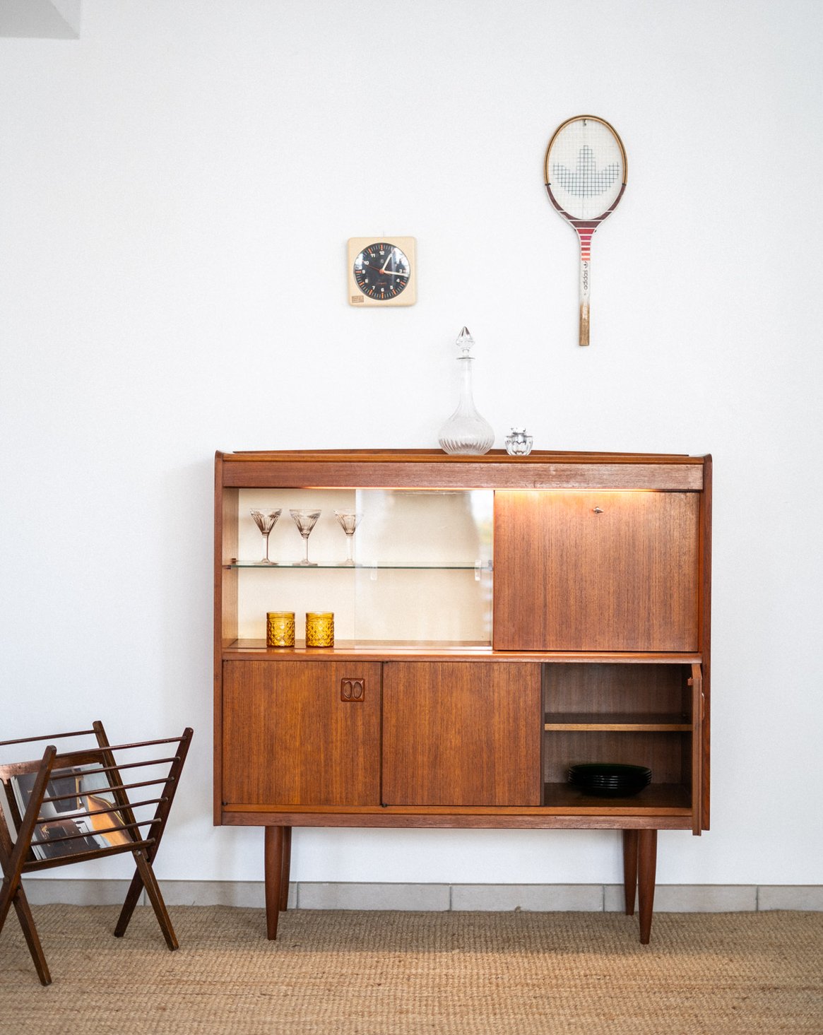 Découvrez ce buffet scandinave des années 60, mêlant élégance et praticité. Sa structure en teck se compose de trois portes en bas et d'un porte-bar sur la droite, tandis qu'une partie vitrée coulissante à droite met en valeur vos objets précieux. Les pieds fuseau ajoutent une touche vintage, bien que la serrure soit non fonctionnelle. Un meuble idéal pour apporter du cachet à votre intérieur tout en offrant un espace de rangement optimisé, le plus une lumière intégrée qui fait son effet.