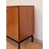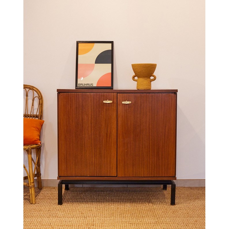 Découvrez ce buffet des années 50 signé Marcel Gascoin, issu de la collection Alvéole, qui incarne l'esthétique moderniste et fonctionnelle du design français. Réalisé en placage de teck sur bois massif et reposant sur un piètement en acier noir à section cubique, il associe proportions équilibrées et lignes épurées. Les poignées en laiton récemment polies apportent une note lumineuse tandis que l'intérieur à étagère derrière deux portes offre un rangement idéal pour vaisselle, livres ou objets décoratifs. Petites marques présentes.