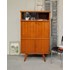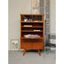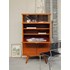 Adoptez ce secrétaire en bois aux pieds compas, qui marie lignes rétro et élégance discrète. La vitrine haute, munie de deux étagères, met en valeur vos livres ou objets, tandis que la partie scribe se verrouille pour protéger vos papiers ; une double porte basse verrouillable assure un rangement soigné et le plateau supérieur offre un espace d'écriture ou d'exposition chaleureux. Il apporte une ambiance accueillante et organisée à un salon, bureau ou entrée. Légères traces du temps présentes.