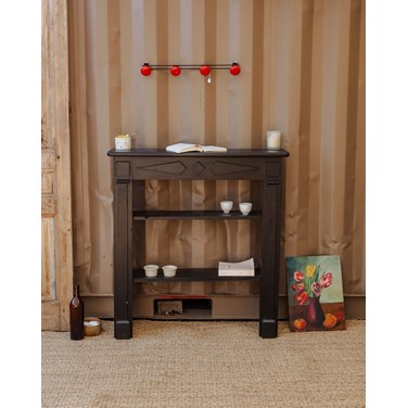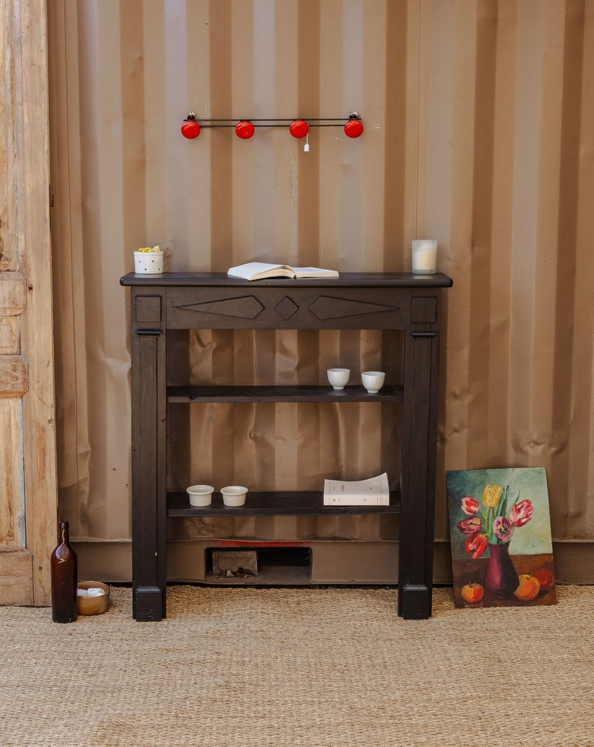Sublimez votre intérieur avec ce manteau de cheminée vintage en pin peint en noir, aux lignes graphiques et aux formes géométriques en relief qui structurent le haut. Ses deux étagères offrent un plan de présentation idéal pour bougies, cadres et objets déco, en jouant sur des proportions qui conviennent à un mur comme à une alcôve. La teinte sombre et la matière chaleureuse du pin apportent une atmosphère élégante et intimiste. Quelques traces du temps présentes.