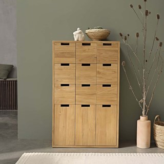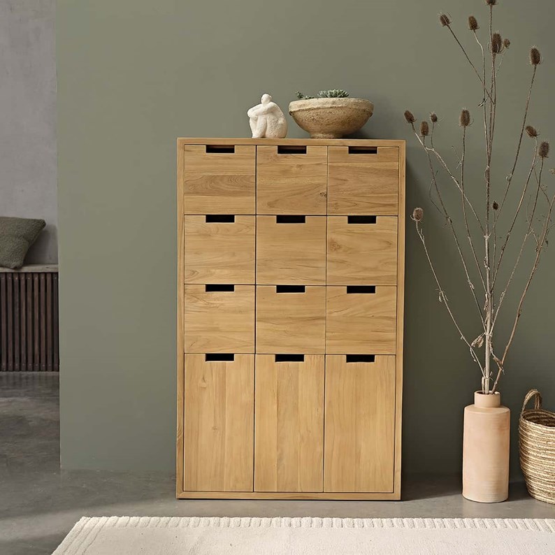 Dans votre entrée, cette armoire en bois de teck trouvera parfaitement sa place pour accueillir chaussures et accessoires. Caractéristiques : Matière : teck- Couleur : naturel - Hauteur : 130 cm - Largeur : 85 cm - Profondeur : 35 cm - Poids : 53 kg - Garantie : 5 ans - Montage : Livré monté. Les + : 9tiroirs – 3 portes – tiroirs amovibles.