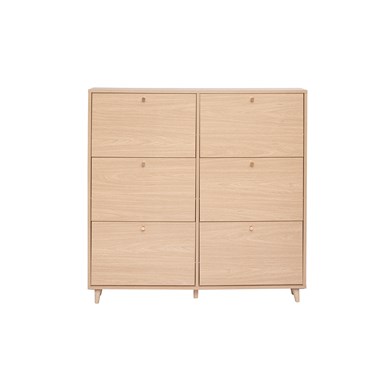 Conçu à partir de panneaux de fibres de bois mélaminé finition chêne clair et soutenu par un solide piètement en chêne massif , ce grand meuble à chaussures aux dimensions L126.6 x P17 x H129.3 cm se distingue par son naturel et son design en toute simplicité.