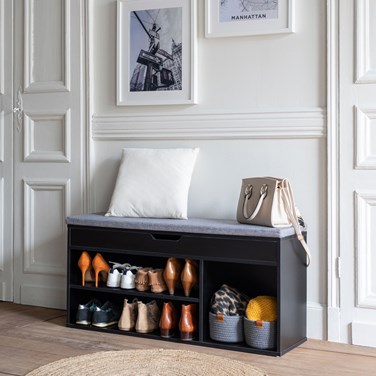 Offrez-vous un meuble de rangement pour chaussures proposant une esthétique minimaliste pour s'intégrer facilement à votre décoration. Le modèle ALAN réunit ces deux fonctions, le design et la praticité, en un seul élément de mobilier. Il possède des compartiments ouverts avec un espace suffisant pour ranger les paires de chaussures que vous mettez le plus souvent. Le coffre supérieur permet d'y dissimuler vos accessoires tels que les lacets ou un chausse-pied. Vous disposez ainsi d'un espace bien organisé sans que rien ne traîne sur le sol de votre maison. Un coussin en mousse au-dessus du coffre vous offre une assise confortable pour enfiler ou retirer vos chaussures.