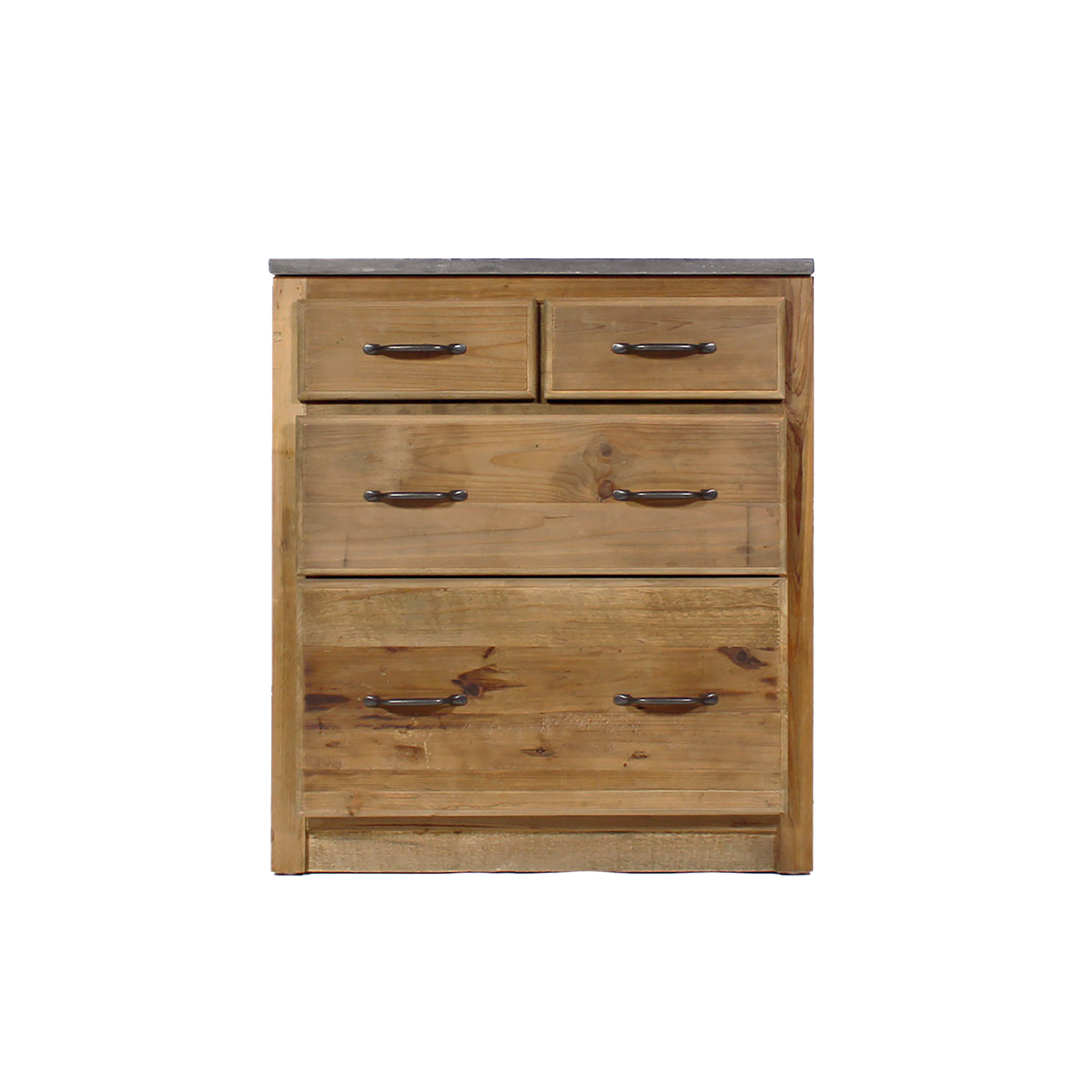 Meuble de cuisine en bois recyclé, métal et pierre bleue de Chine, combinant charme ancien et modernité. Équipé de quatre tiroirs de tailles variées avec poignées en métal pour un rangement pratique. Chaque pièce est unique. Pas de vide sanitaire.