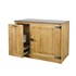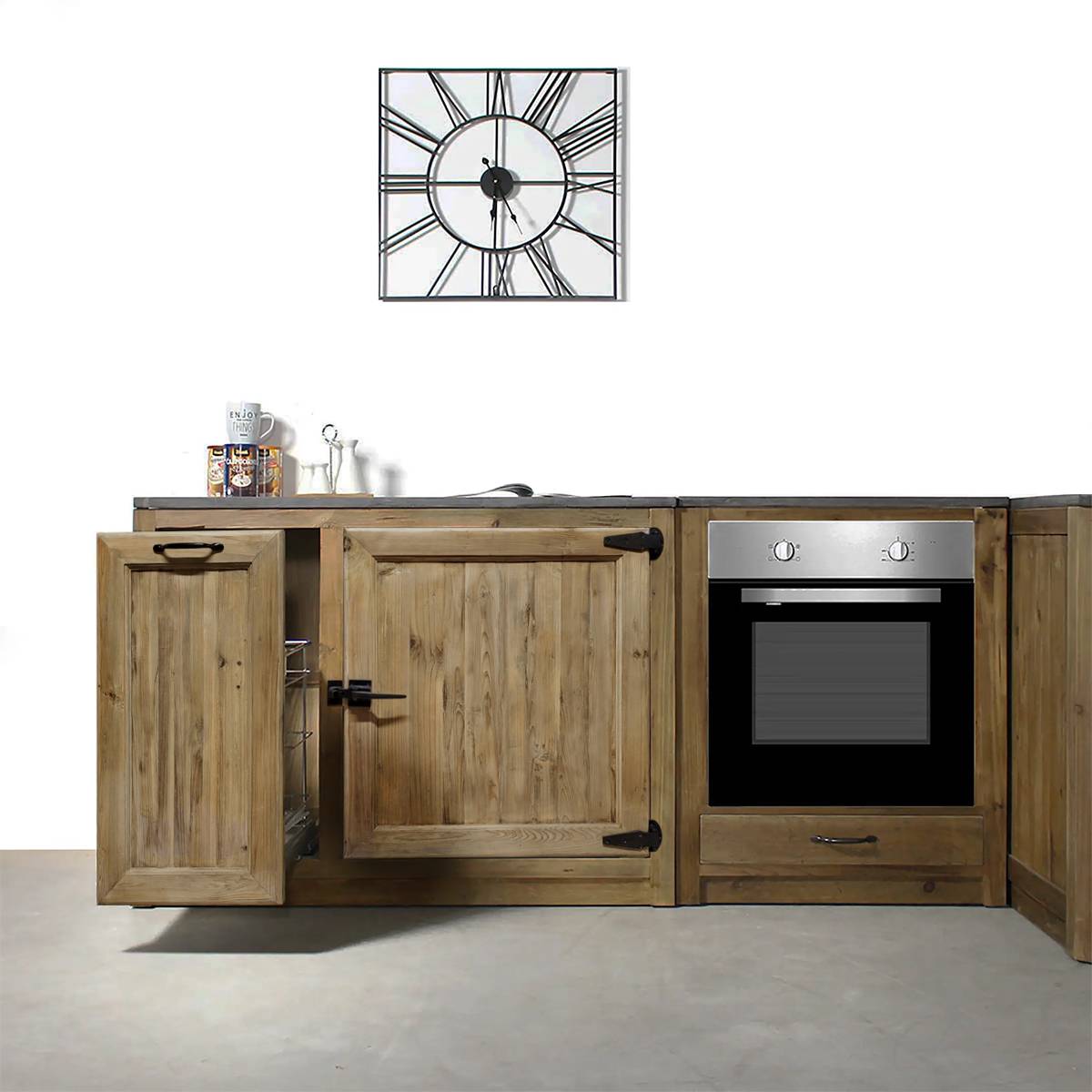 Meuble de cuisine en bois recyclé, métal gris et pierre bleue venant de Chine, alliant charme authentique et modernité. Avec une porte, un tiroir coulissant et une étagère, il offre des rangements pratiques. Chaque pièce est unique. Pas de vide sanitaire.