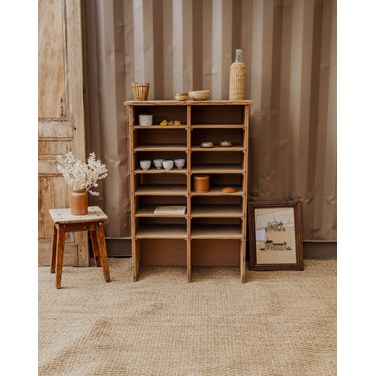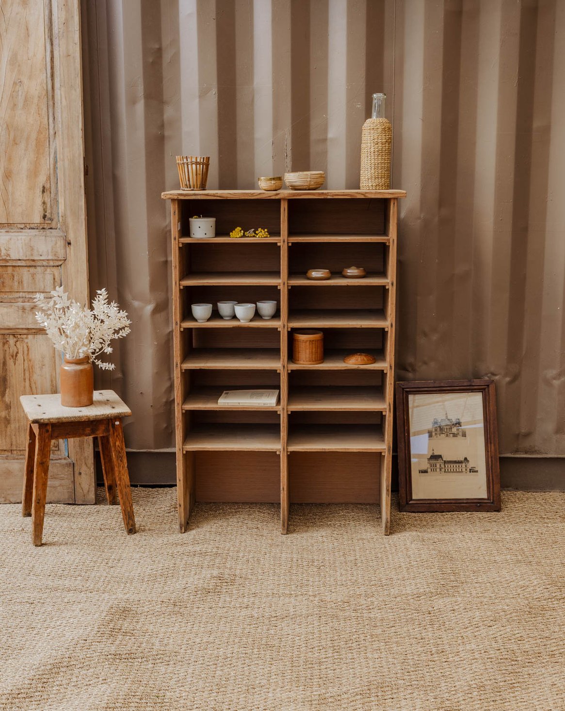 Adoptez ce meuble de métier à douze casiers en bois, dont l'allure sobre et structurée s'intègre naturellement dans un atelier, une entrée ou un coin bureau. Les compartiments réguliers offrent un rangement fonctionnel pour petits objets, papiers et accessoires, pensé pour faciliter l'organisation au quotidien. Sa teinte naturelle et Sa finition simple apportent une ambiance chaleureuse et élégante, entre utilitaire et poésie domestique. Quelques traces du temps présentes.