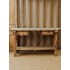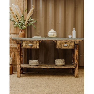Découvrez ce charmant meuble métier ancien, idéal pour apporter une touche d'authenticité à votre intérieur. Son plateau recouvert de zinc lui confère un caractère intemporel, tandis que sa structure en pin assure robustesse et durabilité. Doté de deux tiroirs pratiques et d'un sous-plateau, ce meuble polyvalent peut également servir de console, s'intégrant facilement dans différents styles de décoration. Un incontournable pour un espace à la fois fonctionnel et élégant.