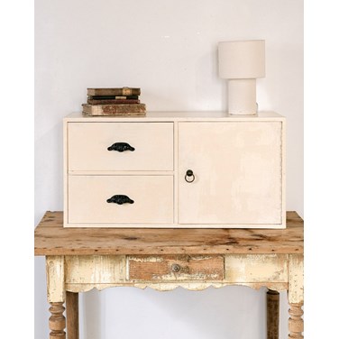 Apportez une touche douce et fonctionnelle avec ce meuble polyvalent en bois peint en beige, pensé pour se poser sur un meuble ou se fixer au mur. Ses deux tiroirs aux poignées coquillage noires et sa niche latérale fermant par poignée et loquet offrent des rangements organisés pour l'entrée, la cuisine ou une chambre, dans un style sobre et chaleureux. Sa proportion facilite l'intégration dans des intérieurs élégants et apaisants. Quelques traces du temps présentes.