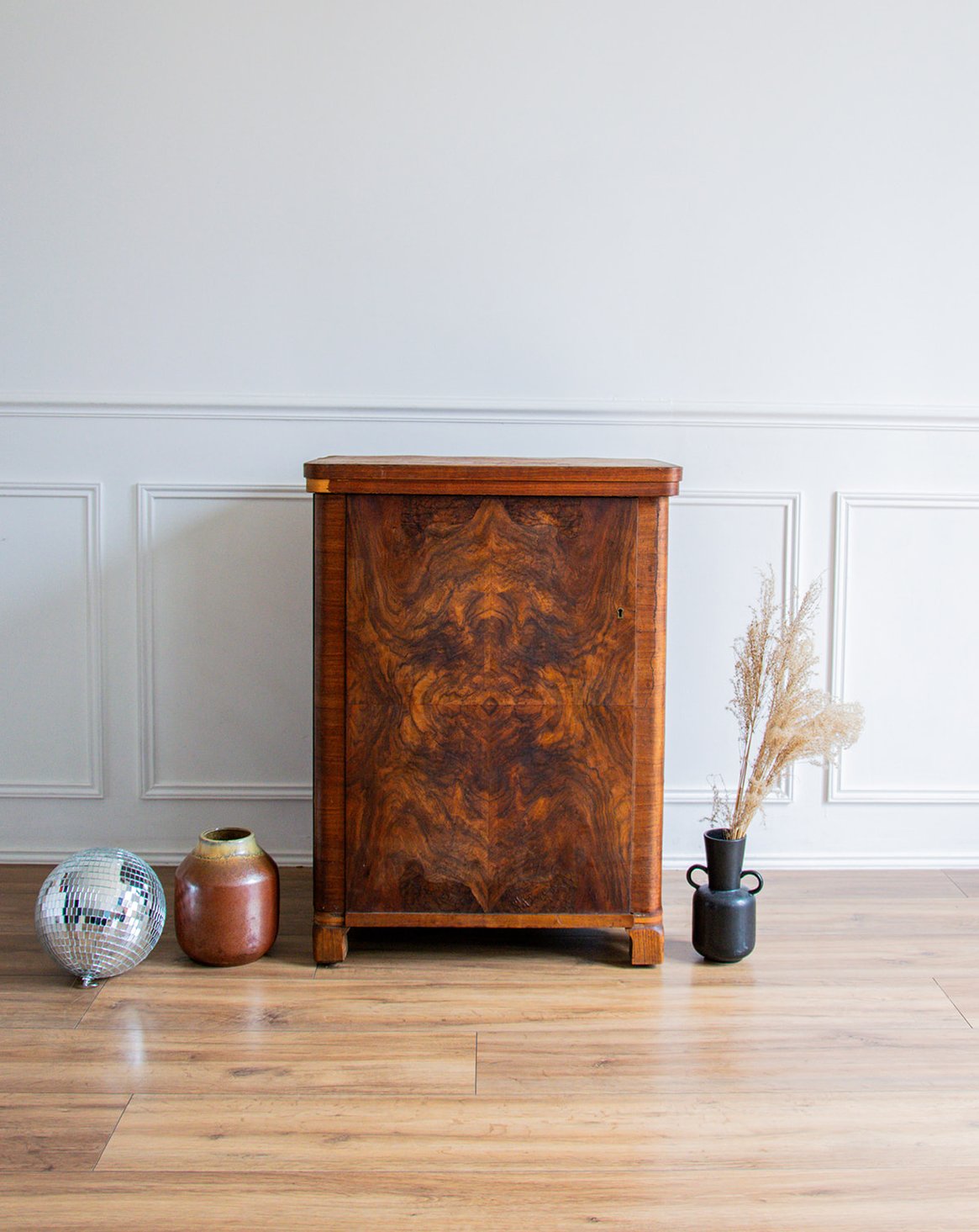 Apportez une touche vintage et pratique à votre intérieur avec ce meuble de rangement intégrant une machine à coudre. En bois avec un joli placage en cerisier, il cache à l’intérieur plusieurs compartiments et étagères pour organiser vos accessoires. La machine à coudre est toujours fonctionnelle, prête à l’emploi pour vos créations. Quelques marques du temps témoignent de son histoire sans altérer son charme. Un meuble aussi décoratif qu’utile, parfait pour les passionnés de couture.