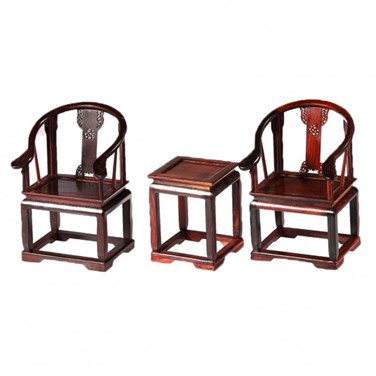 Magnifique ensemble de meubles chinois miniatures présentant une table et deux chaises de style antique classique ! Ces chaises, qui sont accompagnées d'une petite table, sont réalisés en bois de palissandre. De fabrication artisanale, ce sont des objets de décorations absolument stupéfiants ! Vous découvrirez sur ces meubles miniatures une sculpture fine et ciselée et une précision dans le détail étonnante ! Le bois, verni, offre un rendu aussi original que des meubles à l'échelle normale. On aurait presque envie de prendre une pause et de s'installer confortablement sur l'une de ces chaises. Cet ensemble de meubles chinois s'adaptera à tous les types d'intérieur, et ces merveilleux petits objets de décoration créeront une véritable ambiance zen et asiatique. Vous pourrez même les associer à d'autres petits objets de décoration tels que des étagères ou des paravents miniatures. Des objets qui raviront les adeptes d'art miniature et les amoureux de l'artisanat et de la culture asiatique ! Vous apprécierez le travail et le savoir faire de ces artisans qui savent recréer à merveille le style des meubles antiques chinois. Matière des miniatures de meuble chinois : palissandre. Dimensions des miniatures de meuble chinois : chaises de 16 cm de hauteur et 10,5 cm de largeur, table de 9 cm de hauteur et 7 cm de largeur. Couleur des miniatures de meubles chinois : bois.