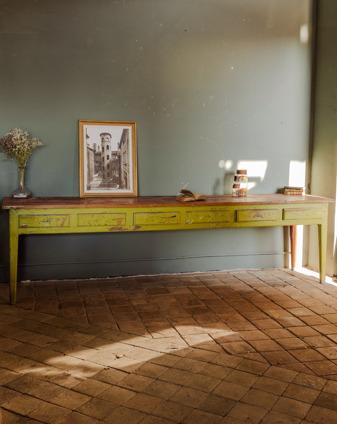 Offrez à votre intérieur une ancienne table de communauté en bois aux contrastes séduisants : plateau rouge patiné et structure vert qui attirent le regard. Pensée pour accueillir plus d'une dizaine de convives, elle intègre six tiroirs fonctionnels ornés de poignées argentées, et son dos travaillé en fait aussi un îlot central ou un meuble indépendant selon l'usage. Son caractère rustique et sa palette colorée apportent une atmosphère chaleureuse et singulière. Quelques traces du temps qui racontent son histoire.