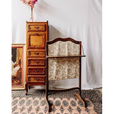 Sublimez votre cheminée avec ce pare-feu en bois foncé, au galbe sobre et au panneau habillé d'un tissu fleuri qui apporte une touche rétro et chaleureuse. Ses pieds écartés assurent une assise stable devant le foyer, tandis que la petite tablette repliable et ses crochets intégrés offrent un espace pratique pour poser une tasse, accrocher un ustensile ou suspendre un accessoire. Idéal pour créer une atmosphère accueillante dans un salon ou une véranda, il allie fonctionnalité et élégance traditionnelle.