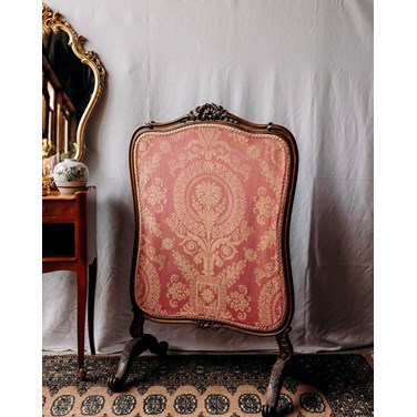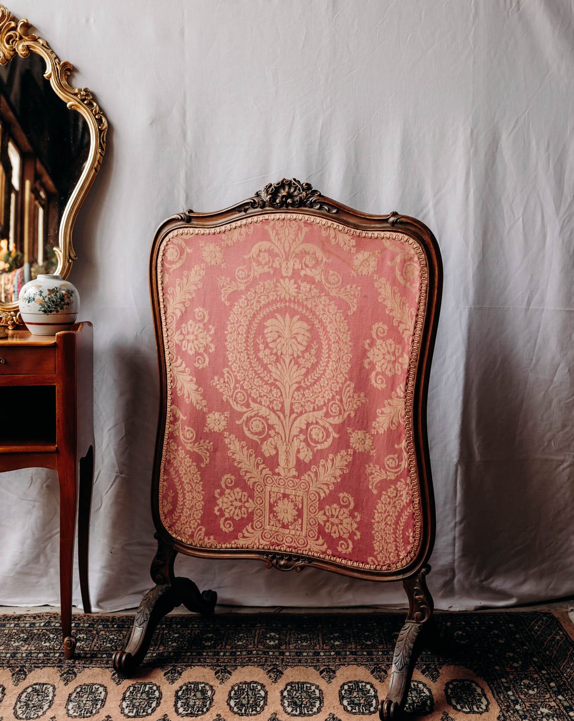 Invitez la douceur à votre intérieur avec ce pare-feu de cheminée en bois foncé habillé d'un tissu fleuri rose, qui marie protection et élégance. Les pieds écartés assurent une assise stable et soulignent sa silhouette bien proportionnée, idéale pour encadrer un feu dans un salon ou une chambre. Son style romantique mais sobre crée une ambiance chaleureuse et graphique, apportant une note décorative tout en remplissant sa fonction pratique. Légères usures à l'arrière.