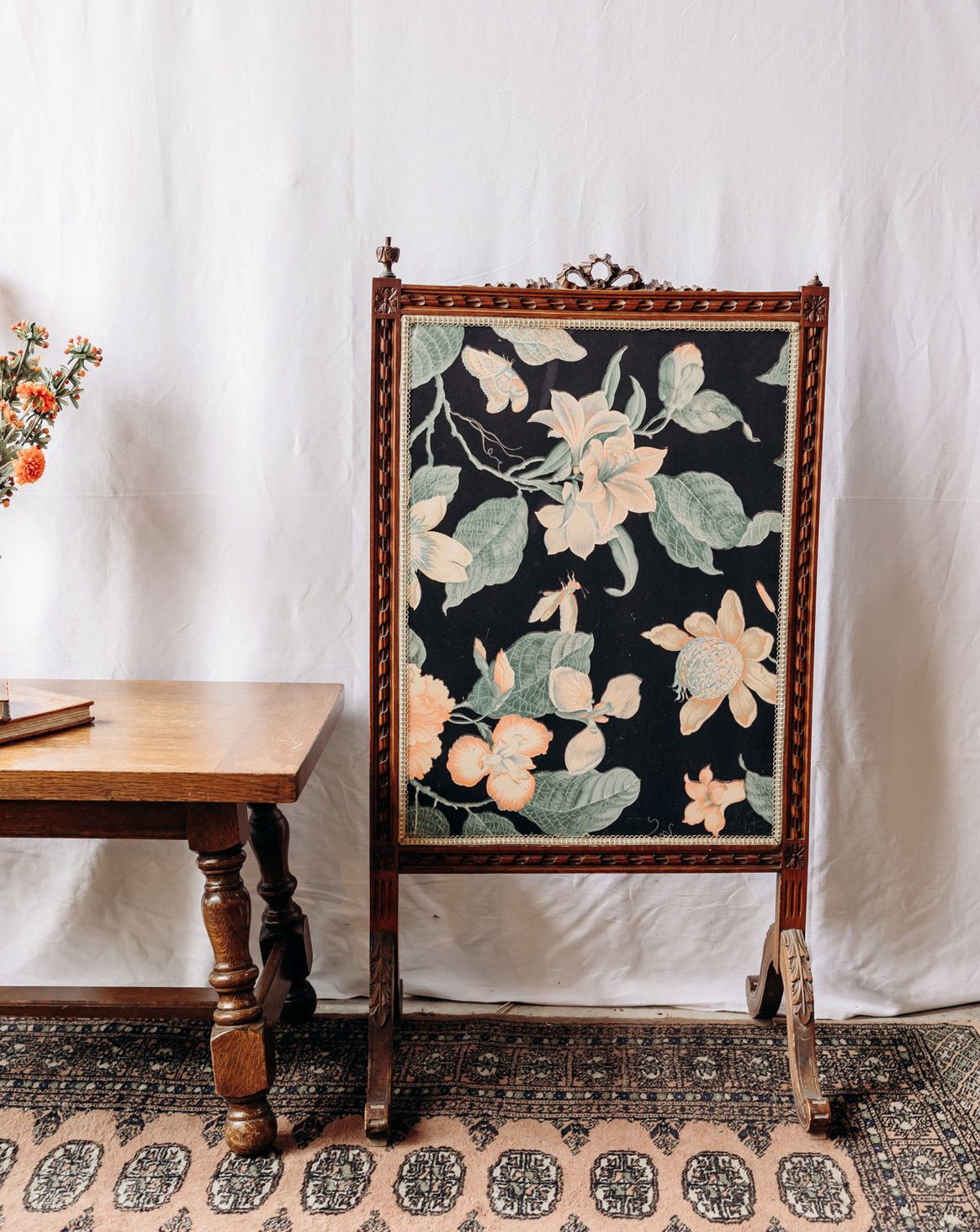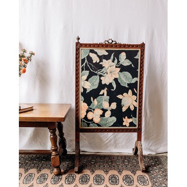 Apportez une touche d'élégance romantique à votre cheminée avec ce pare-feu en bois foncé aux pieds écartés, où un tissu fleuri réchauffe l'ensemble; le petit nœud en bois souligne le détail artisanal et apporte une note délicate. Sa construction stable protège l'âtre tout en conservant des proportions harmonieuses, adaptées à un foyer de taille modérée, et invite une ambiance cosy et légèrement rétro dans le salon. Petit manquement en haut à droite.