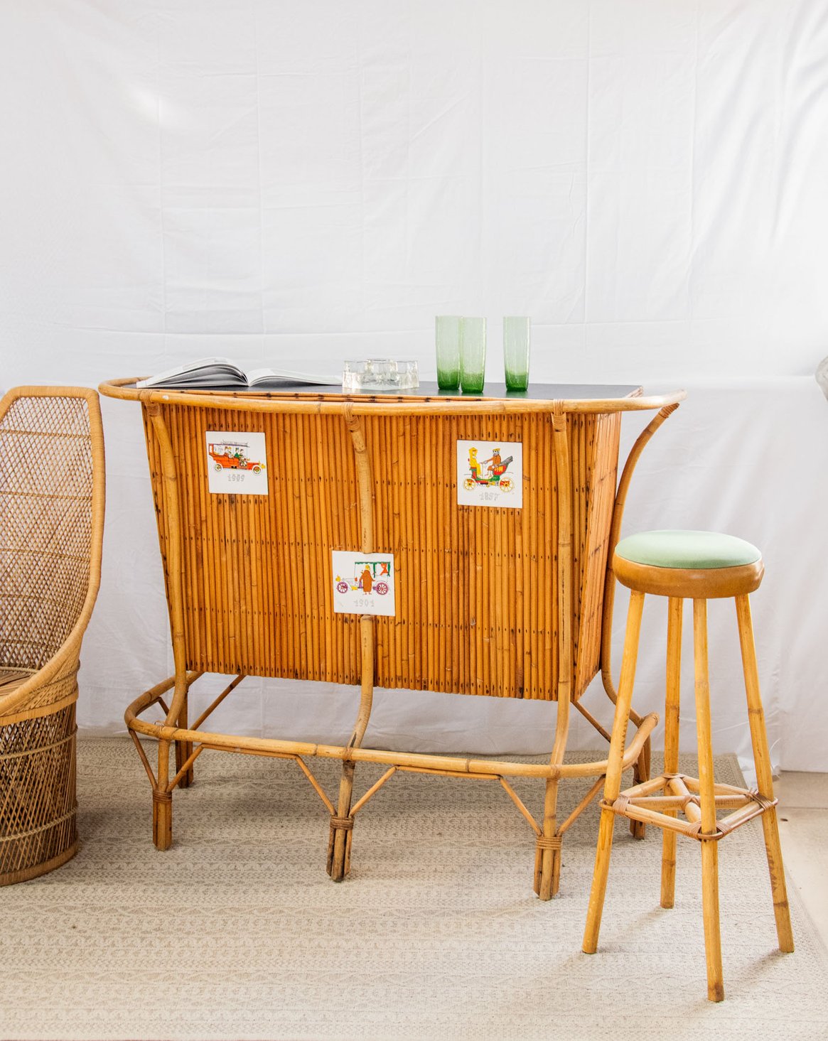 Découvrez notre élégant bar en rotin, alliant modernité et charme intemporel. Avec ses pieds fins et son plateau noir, il s'intègre parfaitement dans tout type d'intérieur. Ce meuble pratique offre deux espaces de rangement à l'intérieur, dotés de grandes niches pour accueillir vos bouteilles et accessoires. La touche finale est apportée par ses trois carreaux de faïence blancs à l'avant, ornés de délicats dessins peints, ajoutant une note artistique à votre espace. Un choix idéal pour les amateurs de décoration raffinée !